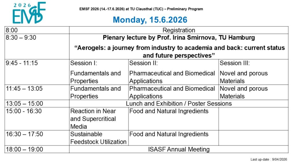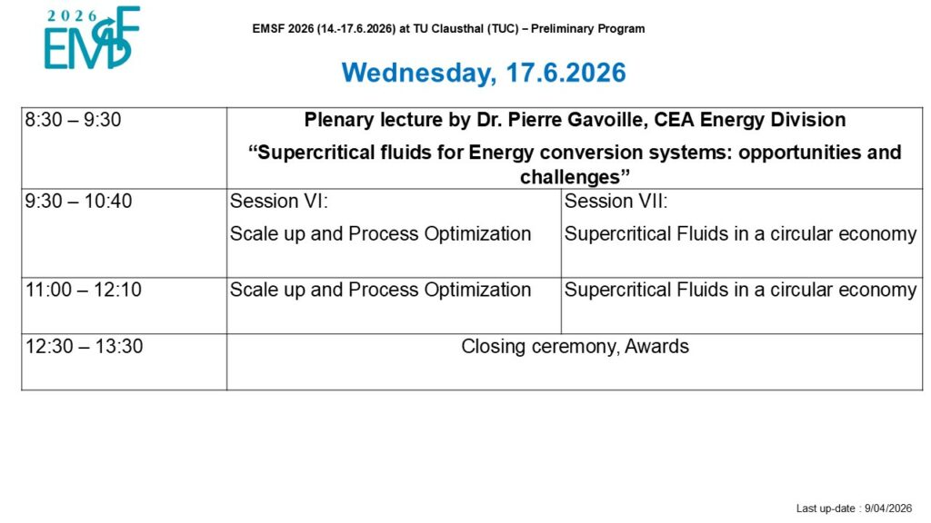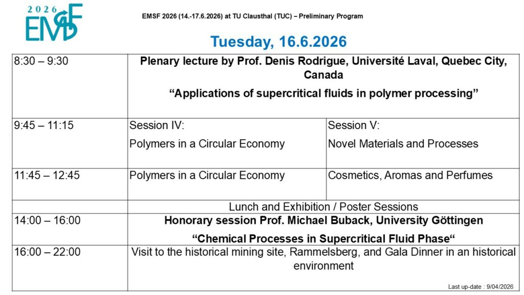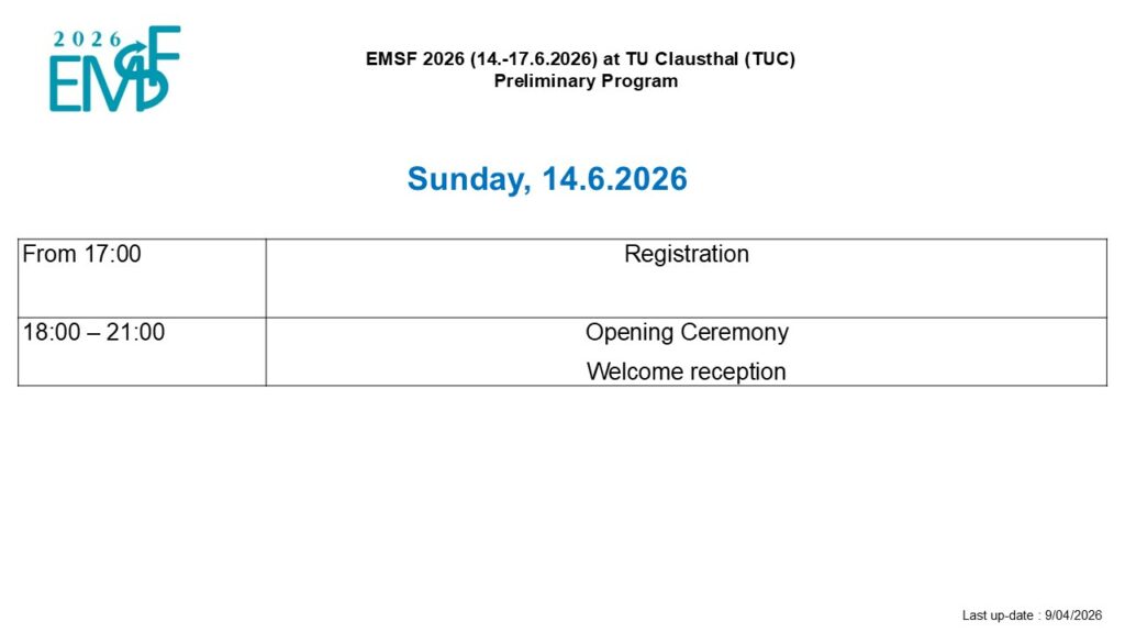 Program Sunday 14th JuneWelcome ReceptionWelcome ReceptionMonday 15th - Wednesday 17th June3-days conferences3-days conferenceThe 3-days conference will take place at TU Clausthal.Each day will start with a plenary lecture, followed by parallel sessions of key notes and oral communications.Poster sessions will take place during coffee break. Tuesday 16th June eveningGala dinnerGala dinner Gala Dinner will take place at the heart of the Harz mountains in the ancient mine of Rammelsberg. Monday 15th June - Wednesday 17th JuneExhibitionExhibition Exhibition hall will be open during all three days. Preliminary Program